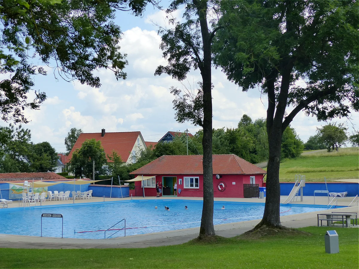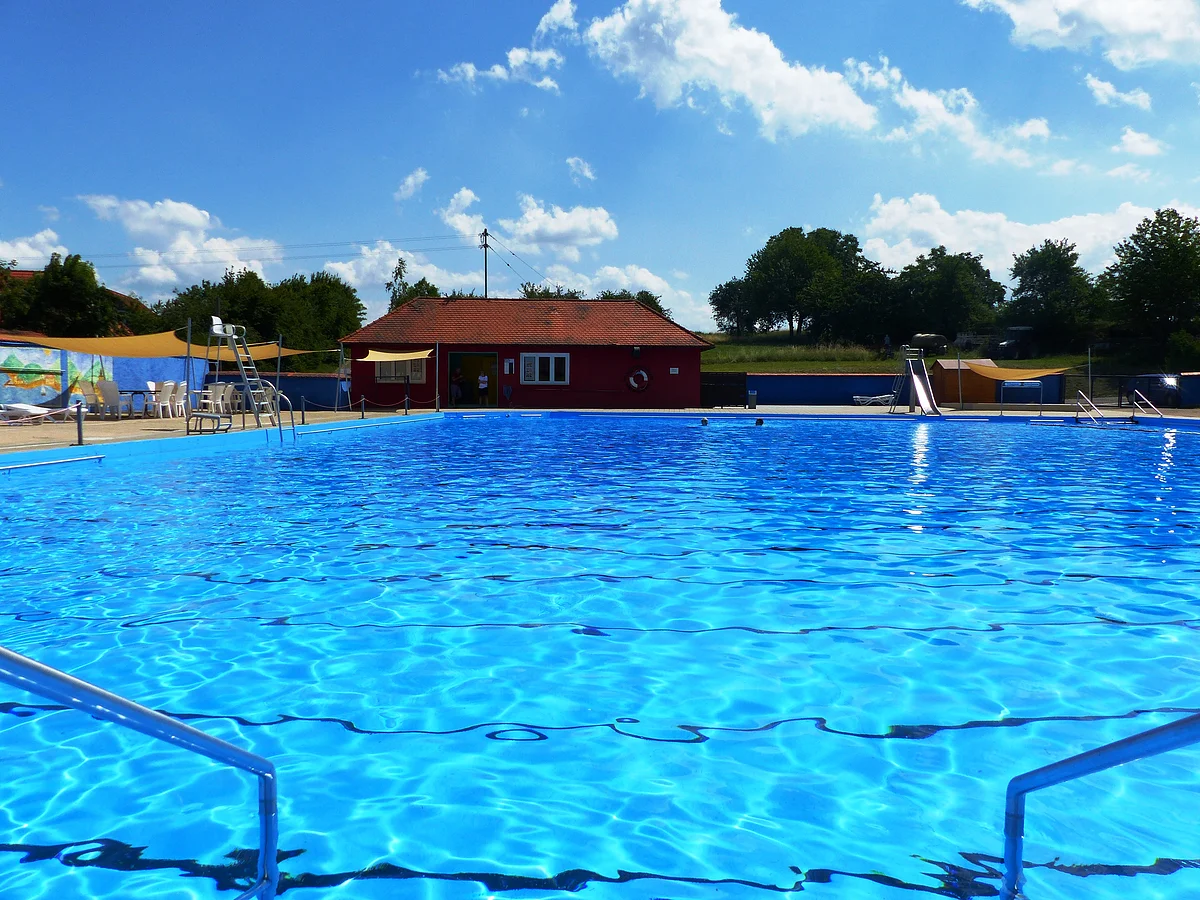 Neben dem unbeheizten Schwimmbecken verfügt die Anlage über eine Wasserrutsche, eine schöne Liegewiese, Umkleidekabinen und einen Kiosk.