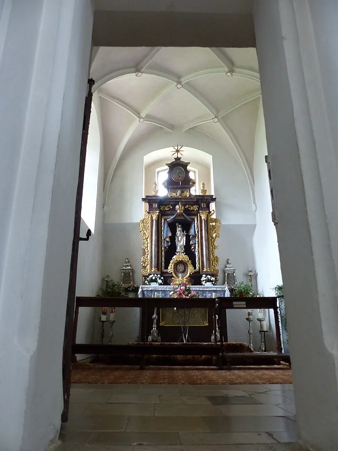Die Walburgakapelle ist unter einem spätgotischen Netzrippengewölbe aus dem 16. Jahrhundert zu bewundern. Der Altar der Kapelle birgt einen kostbaren Schatz: Die 65 cm hohe Statuette der Heiligen Walburga, die gegen 1700 vom Augsburger Goldschmied Michael Hueter aus Silberblech getrieben wurde. Davor ein weiteres Reliquiar mit einer damals von Eichstätt nach Monheim überführten Walburgisreliquie.
