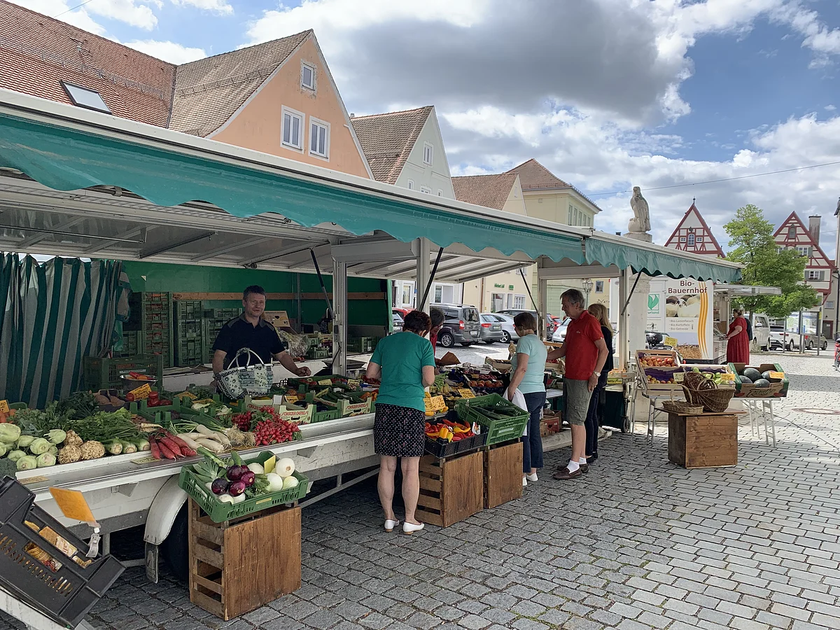 Jeden Freitag lädt der Wochenmarkt auf dem Monheimer Marktplatz dazu ein, frische und regionale Produkte einzukaufen.